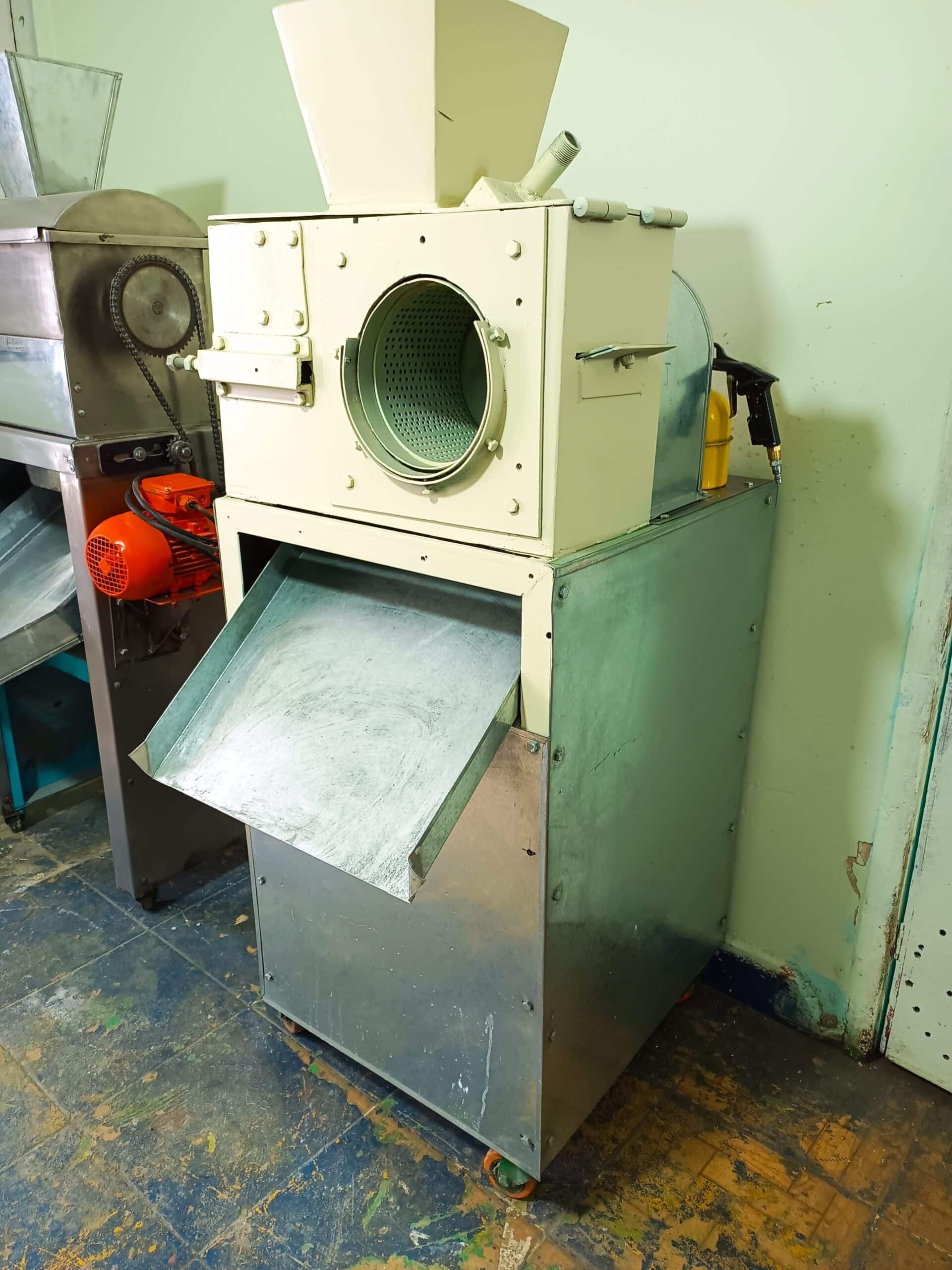 Mescladora en acero inoxidable para homogenizar la materia prima, con motor reductor de 5H.P trifásico a 220V, aletas graduables en la parte interior del equipo y salida del material, capacidad 50 kilos aproximadamente.